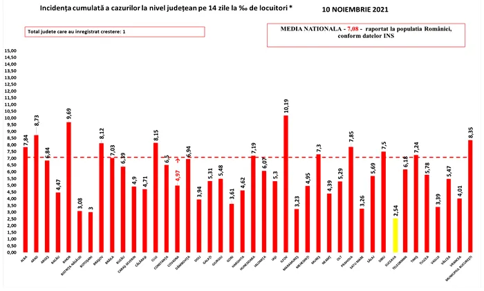 Singurul județ cu rata de incidență sub 3 este Suceava, cu incidență 2,54 la mia de locuitori, urmat de Botoșani – 3 și Bistrița-Năsăud – 3,08.