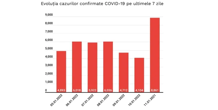 Conform datelor existente la nivelul CNCCI la data de 11 ianuarie 2022, ora 10.00, în intervalul de 24 de ore, au fost înregistrate 8.861 cazuri de persoane pozitive cu SARS-COV-2. De asemenea, au fost raportate 43 decese. Nu sunt raportate decese anterioare.