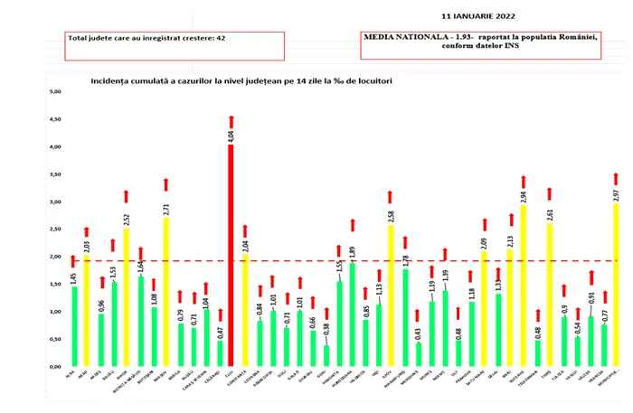 Incidența infectărilor cumulate la 14 zile, raportate la 1.000 de locuitori – calculat de către Direcțiile de Sănătate Publică, la nivelul Municipiului București și al județelor – a ajuns, la nivel național, la o medie aproape de pragul de 2 la mie. Singurul județ scenariu roșu este Clujul, cu 4.04 la mie incidența.