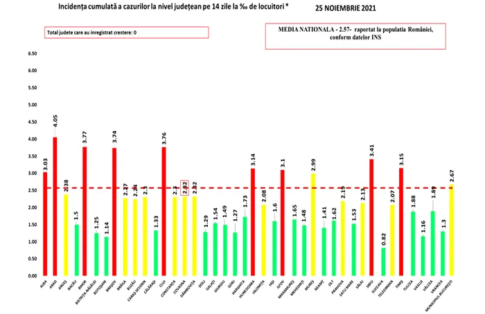 Incidența cumulată a cazurilor la nivel național din ultimele 14 zile a ajuns joi 25 noiembrie la o medie de 2,57 la mia de locuitori, în scădere de la 2,71 miercuri.