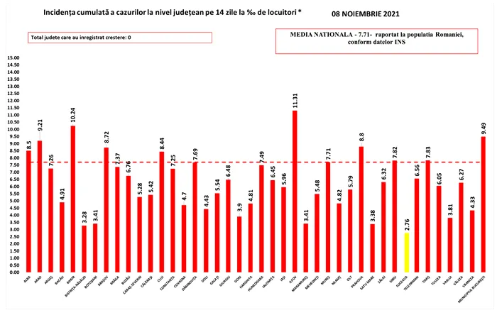 Incidența cumulată a cazurilor la nivel național din ultimele 14 zile a ajuns luni 8 noiembrie la o medie de 7,71 la mia de locuitori, în scădere de la 8,10 duminică.