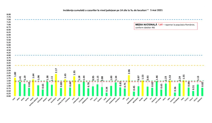 Coeficientul infectărilor cumulate la 14 zile, raportate la 1.000 de locuitori este calculat de către Direcțiile de Sănătate Publică, la nivelul Municipiului București și al județelor.