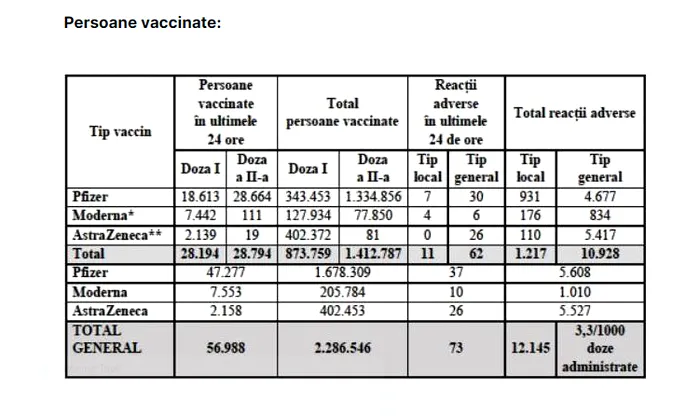 De la începutul campaniei de vaccinare, s-au înregistrat 12.145 de reacţii adverse la vaccinurile Pfizer, Moderna şi AstraZeneca, 1.217 de tip local şi 10.928 de tip general.