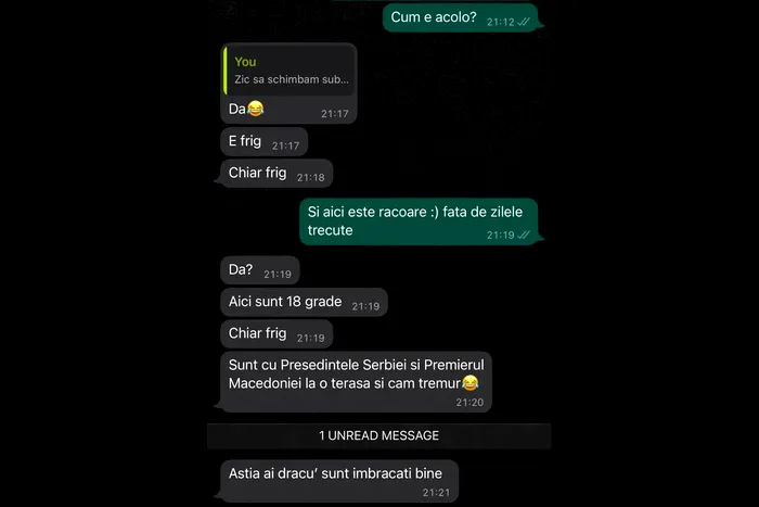 – Da? Aici sunt 18 grade, chiar frig. Sunt cu președintele Serbiei și premierul Macedoniei la o terasă și cam tremur. Ăștia, ai dracu’, sunt îmbrăcați bine.