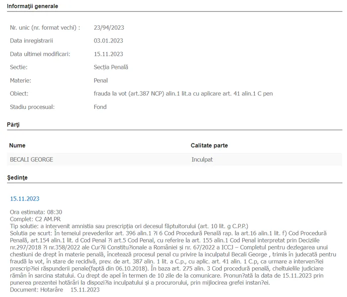 ”Tip soluție: a intervenit amnistia sau prescripţia ori decesul făptuitorului (art. 10 lit. g C.P.P.) Soluția pe scurt: În temeiul prevederilor art. 396 alin.1 și 6 Cod Procedură Penală rap. la art.16 alin.1 lit. f) Cod Procedură Penală, art.154 alin.1 lit. d Cod Penal și art.5 Cod Penal, cu referire la art. 155 alin.1 Cod Penal interpretat prin Deciziile nr.297/2018 și nr.358/2022 ale Curții Constituționale a României şi nr. 67/2022 a ICCJ – Completul pentru dezlegarea unui chestiuni de drept în materie penală, încetează procesul penal cu privire la inculpatul Becali George, trimis în judecată pentru fraudă la vot, în stare de recidivă, prev. de art. 387 alin. 1 lit. a C.p., cu aplic. art. 41 alin. 1 C.p, ca urmare a intervenției prescripției răspunderii penale (faptă din 06.10.2018). În baza art. 275 alin. 3 Cod procedură penală, cheltuielile judiciare rămân în sarcina statului.