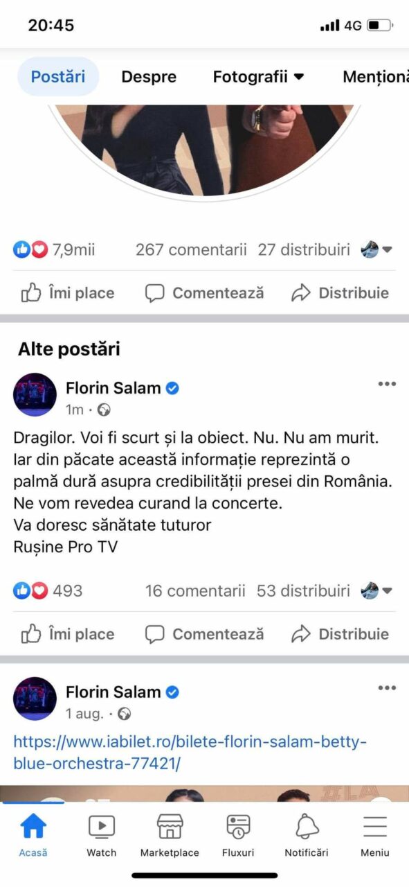 „Nu am murit. Iar din păcate această informație reprezintă o palmă dură asupra credibilității presei din România. Ne vom revedea curând la concerte. Vă doresc sănătate tuturor”, a scris Florin Salam pe pagina sa de socializare.