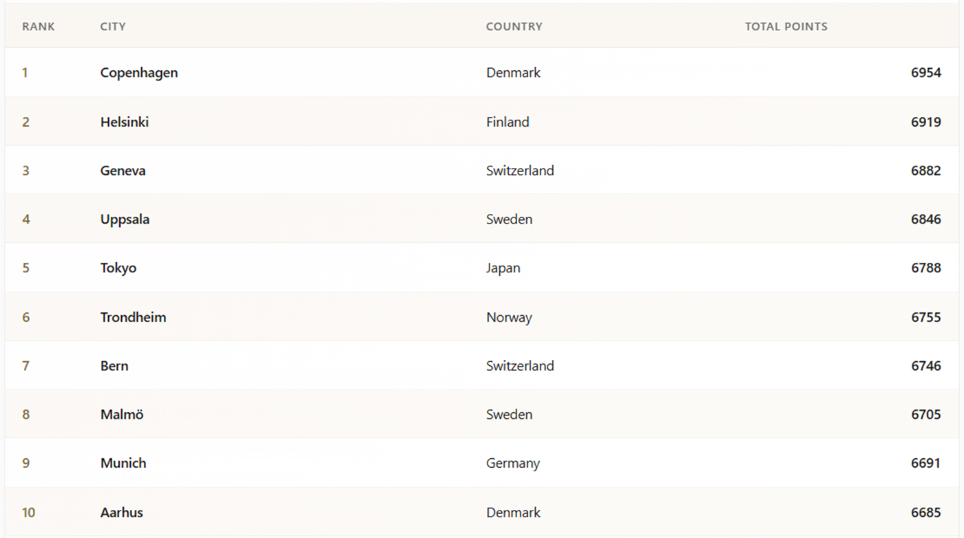 Așa cum era de așteptat, orașele europene nordice conduc autoritar acest clasament.