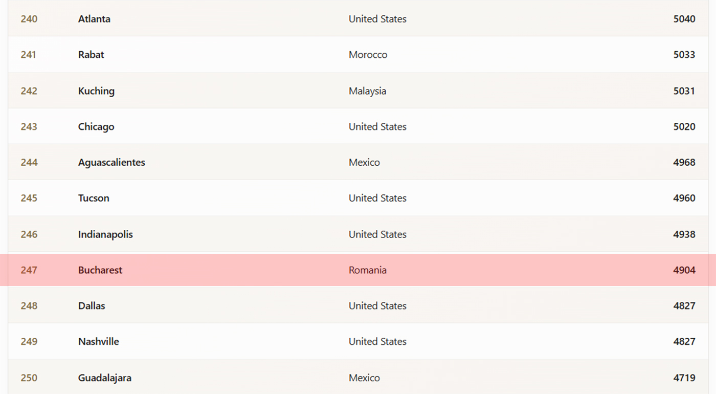 București a reușit să se claseze pe locul 247. Dar, pe de altă parte Capitala României este în top 10 european la bogăție.