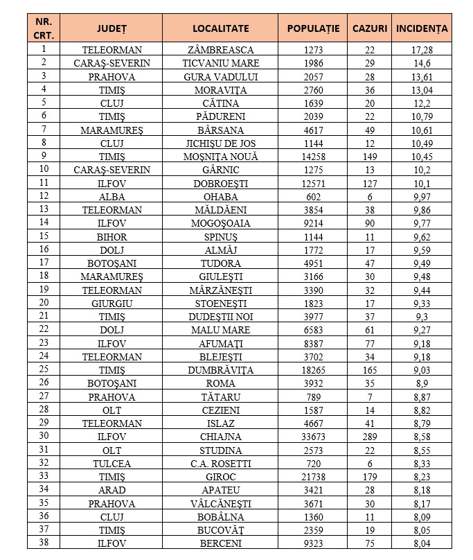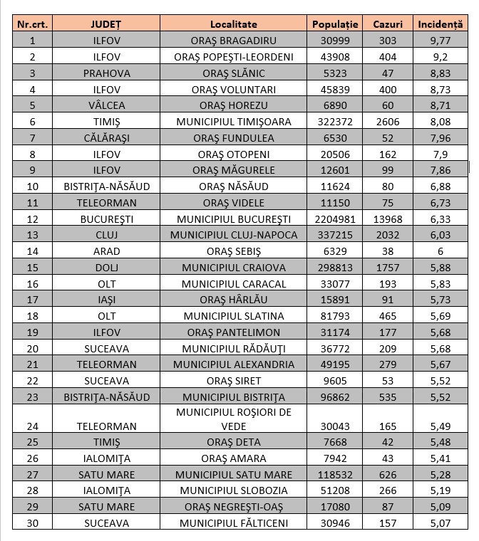 Iată primele 12 orașe în ordinea descrescătoare a incidenței: