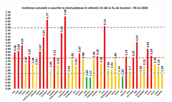 Conform ultimei raportări a Grupului de Comunicare Strategică, judeţul Constanţa se află în scădere, cu o rată de infectare de 7,09, însă se situează pe primul loc în ţară, iar Bucureştiul ajunge pe locul doi, cu 6,77 cazuri la mia de locuitori, urmat de judeţul Ilfov, cu 6,14.
