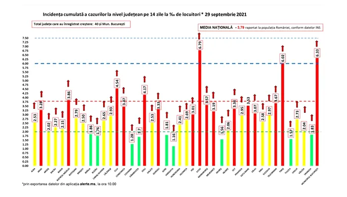 Bucureștiul se menține pe prima poziție în topul celor mai ridicate incidențe, cu 6,33 cazuri la mia de locuitori și alte 1.561 de îmbolnăviri înregistrate de marți până miercuri. Pe locul 2 se află județul Dolj cu 512 cazuri noi și o incidență de 4,17 ‰, iar pe locul 3 este județul Timiș cu 494 cazuri noi și o incidență de 6,02 ‰.  Bucureștiul și alte 15 județe sunt în scenariul roșu.
