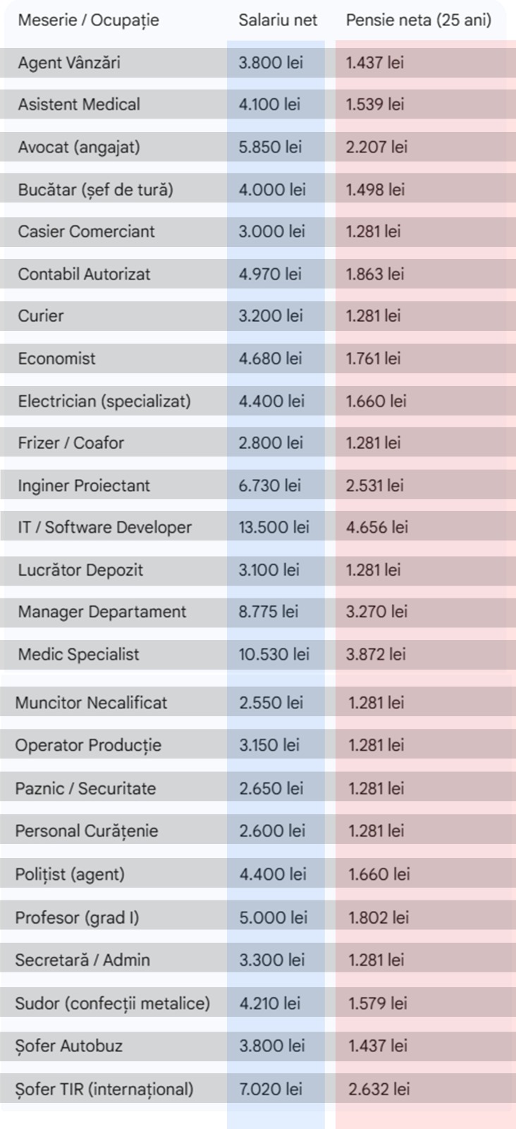 Te-ai gândit câți bani vei primi la pensie, în funcție de meseria ta, dacă ai o vechime de 25 de ani? Gândul.ro a întocmit un tabel în care  aduce în atenție 25 cele mai populare meserii în România, salariul net pentru ocupațiile respective, precum și venitul care ar putea fi încasat din pensie, lunar.