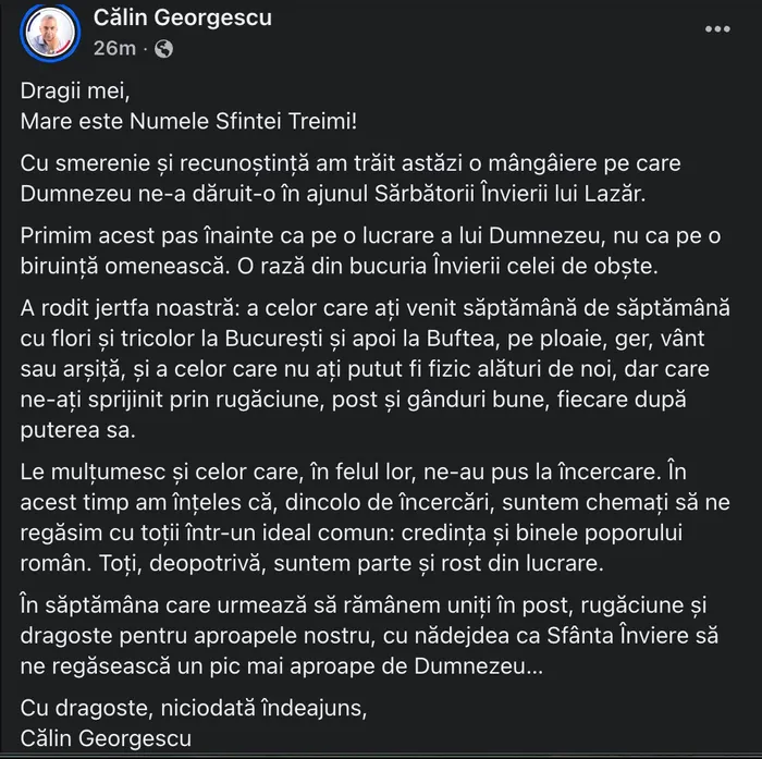 Le mulțumesc și celor care, în felul lor, ne-au pus la încercare. În acest timp am înțeles că, dincolo de încercări, suntem chemați să ne regăsim cu toții într-un ideal comun: credința și binele poporului român”, a scris Călin Georgescu pe pagina sa de Facebook.