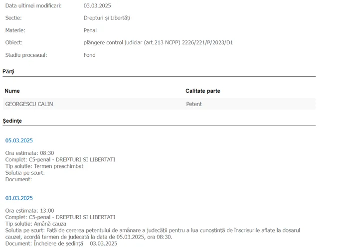Inițial, Judecătoria Sectorului 1, pe rolul căreia a fost înregistrat procesul, a stabilit termenul de judecată pentru data de 5 martie, însă ulterior a fost schimbat, cererea lui Călin Georgescu urmând să se judece luni, 3 martie.
