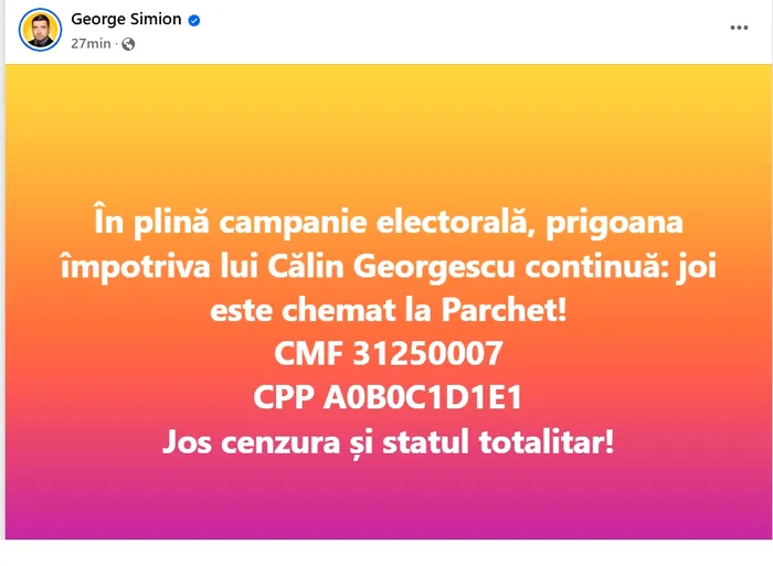 „Jos cenzura și statul totalitar!”, a mai scris Simion.