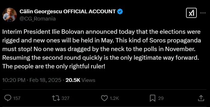 „Președintele interimar Ilie Bolovan a anunțat astăzi că alegerile au fost trucate și vor avea loc în luna mai. Acest tip de propagandă Soros trebuie să înceteze! Nimeni nu a fost târât de gât la vot în noiembrie. Reluarea rapidă a rundei secunde este singura cale legitimă de urmat. Poporul este singurul conducător de drept”, a afirmat Georgescu, pe X.