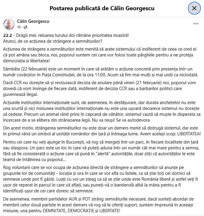 Călin Georgescu a cerut Curții Constituționale revizuirea deciziei anulării alegerilor. Dacă acest lucru nu se va întâmpla, a transmis susținătorilor săi, printr-o postare pe Facebook,  să strângă semnături pentru candidatura sa, sâmbătă, 22 februarie, în Piața Constituției.