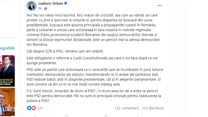 Ludovic Orban este foarte categoric în privința deciziei celor de la Curtea Constituțională, în cazul Dianei Șoșoacă. Liderul Forța Dreptei consideră că doar ipocrizia este aceea care nu-i lasă liniștiți pe aceia care deplâng dispariția Dianei Șoșoacă din cursa prezidențială. Acesta a transmis că nu va „vărsa nicio lacrimă” pentru „goarna principală a propagandei rusești în România,”