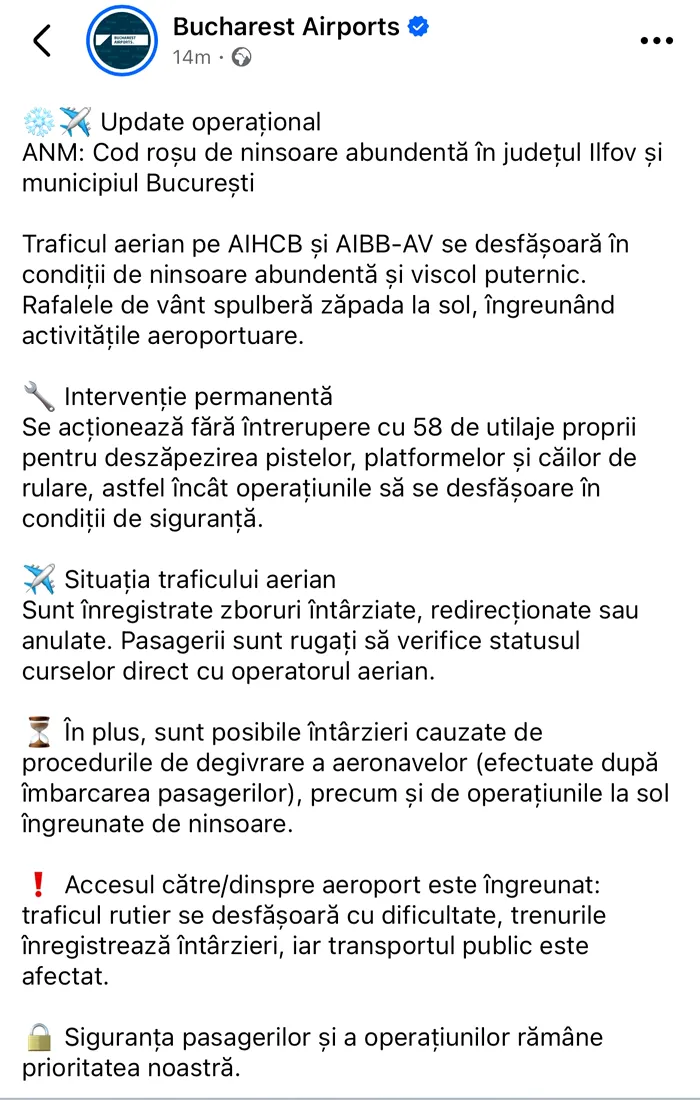 Update 10:45: Traficul aerian pe Aeroportul Internațional Henri Coandă și Aeroportul Băneasa se desfășoară în condiții dificile. Viscolul puternic și rafalele de vânt spulberă zăpada la sol, îngreunând activitățile aeroportuare. Din cauza condițiilor meteo, mai multe curse sunt întârziate, redirecționate sau anulate.