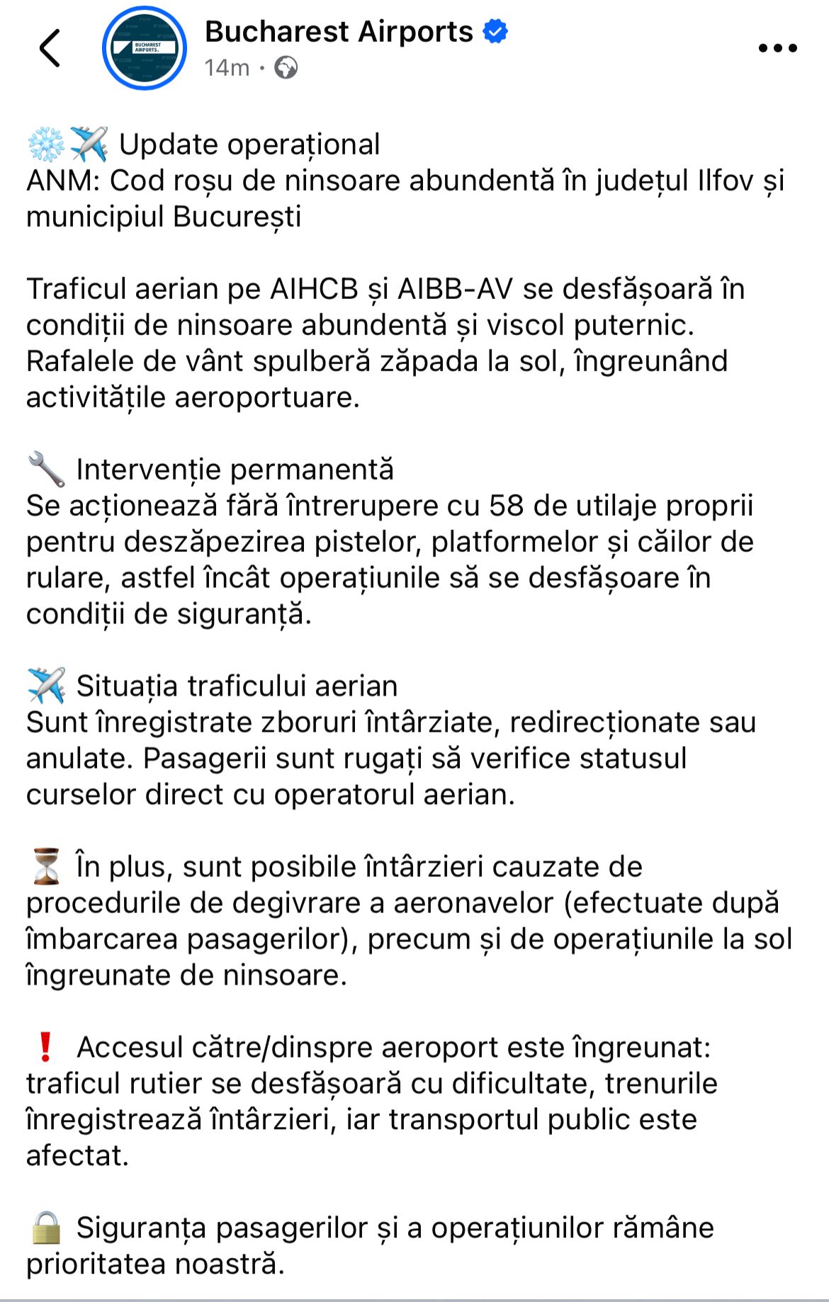 Update 10:45: Traficul aerian pe Aeroportul Internațional Henri Coandă și Aeroportul Băneasa se desfășoară în condiții dificile. Viscolul puternic și rafalele de vânt spulberă zăpada la sol, îngreunând activitățile aeroportuare. Din cauza condițiilor meteo, mai multe curse sunt întârziate, redirecționate sau anulate.