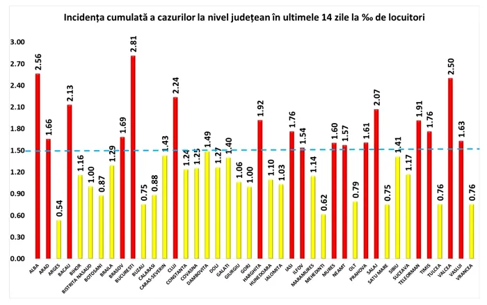 În topul județelor cu cele mai ridicate incidențe sunt Alba, Vâlcea, Cluj, Bacău și Sălaj, toate înregistrând peste 2 cazuri la mia de locuitori în ultimele două săptămâni.