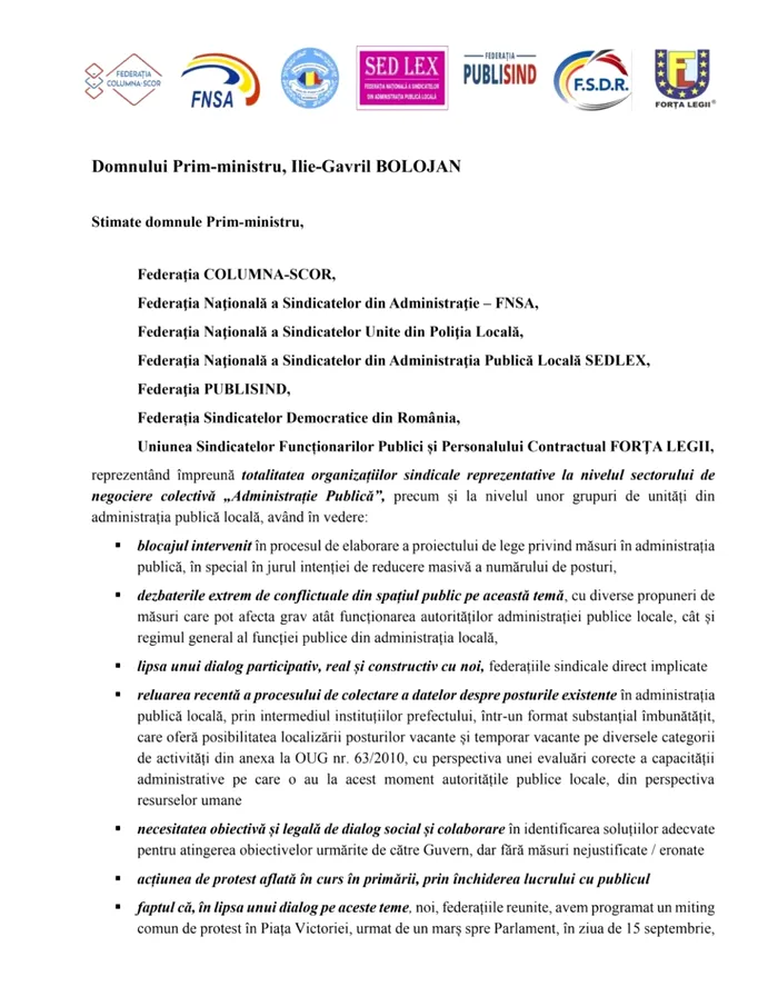 „Federațiile bugetare, care urmează să participe la acțiunea masivă de protest de luni, 15 septembrie 2025, au lansat Guvernului și Președintelui Camerei Deputaților o ultimă invitație la dialog.