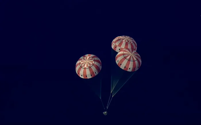 Capsula a lansat aproape o duzină de parașute pentru a-și ușura coborârea. Pentru asta, a încetinit în siguranță nava spațială de 21.000 de livre de la viteze mari la aproximativ 32.187 de km/h pentru aterizare.