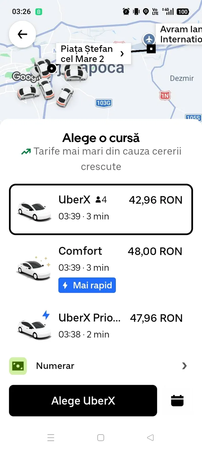 În schimb, în aplicația Uber, pentru același serviciu (UberX), cursa respectivă făcea 42,96 lei; iar pentru categoria superioară, tariful a ajuns la 48 de lei.