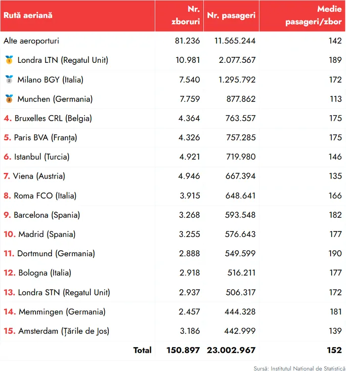 În 2024, cele mai multe zboruri care au decolat de pe aeroporturile din România au avut ca destinație Londra, Milano și Paris. Potrivit Institutului Național de Statistică, aeroporturile din România au înregistrat în anul precedent 26.000.800 pasageri.