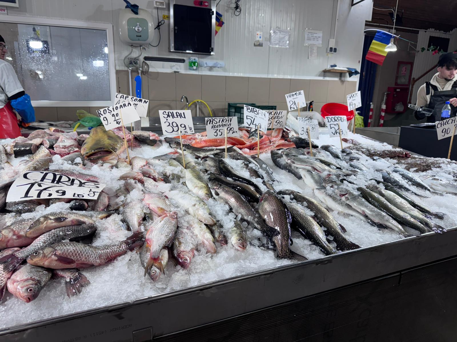 Standurile din piață, luate la pas de Gândul.ro, aduc în atenție unul dintre cele mai populare produse cumpărate de clienți, și anume peștele. Este un aliment care nu lipsește de pe mesele festive de Crăciun și Revelion, fiind gătit la cuptor, pe grătar sau adăugat în diverse preparate. La o primă vizualizare, putem observa că există multe opțiuni dintre care clienții pot alege. Iată câteva dintre ele: