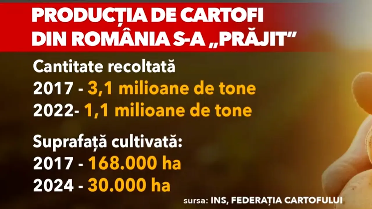 În ultimii 8 ani, producția de cartofi în România a scăzut cu două milioane de tone, iar suprafețele cultivate sunt acum sub 30.000 de hectare. Țara noastră a fost nevoită să importe cartofi mai scumpi din Germania, Polonia și Franța, pentru a acoperi nevoia de consuma a populației.