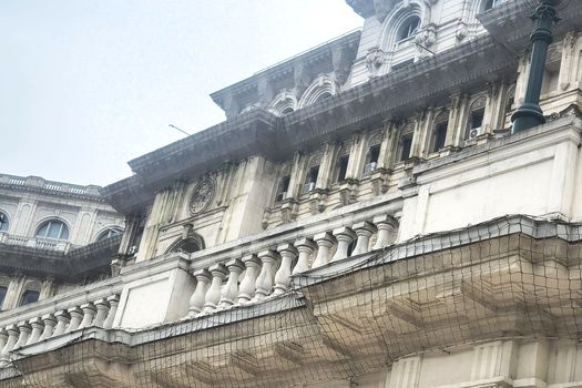 Zidurile de la exterior, dinspre Camera Deputaţilor, sunt pline de bălării ieşite prin pereţii sparţi, decojiţi sau prin balustradele de la balcoanele crăpate de timp.