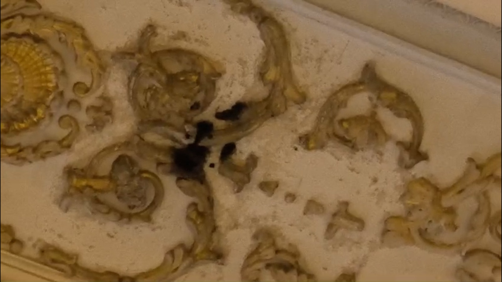 Interioarele impunătoare, pe pereţii cărora odihnesc ţesături scumpe, tablouri şi candelabre impresionează prin dimensiuni. Dincolo de toată această imagine poleită, structura se degradează de la an la an. Apa de la ploaie şi-a săpat drum în interiorul clădirii și a format crevase printre elementele decorative din tavan.