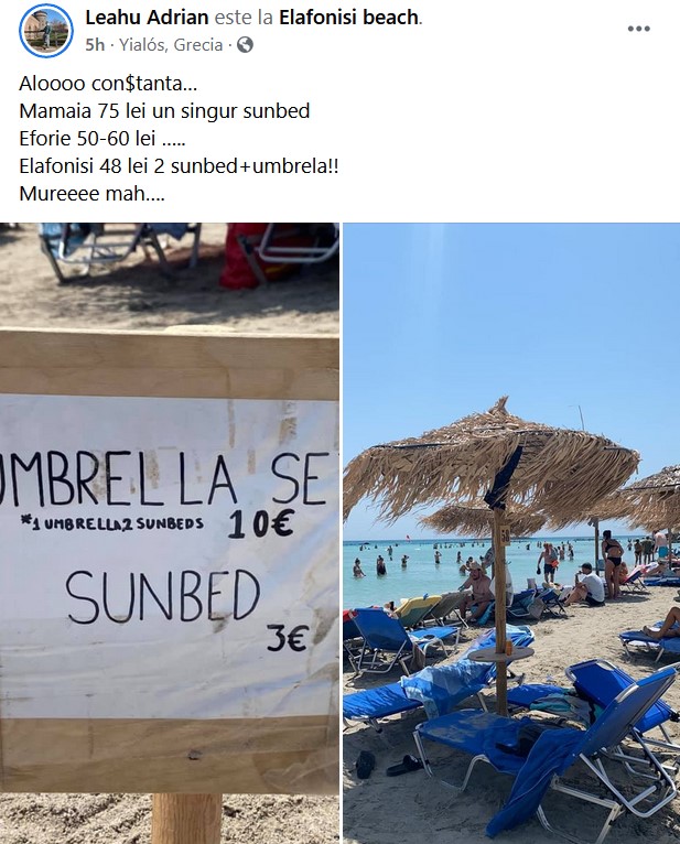 Turiștii români sunt nemulțumiți de diferențele mari între prețurile la șezlonguri pe plajele din România versus cele din Grecia. Un român aflat pe litoralul elen spune că, în Elafonisi, pentru 48 de lei a primit două șezlonguri, dar și umbrelă, în timp ce la Mamaia un singur șezlong l-ar fi costat 75 de lei, iar în Eforie undeva la 50-60 de lei.