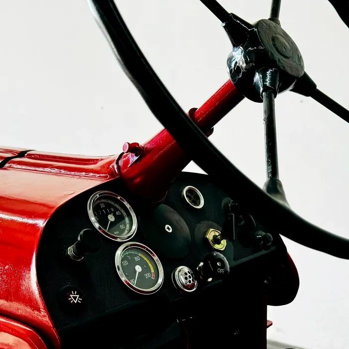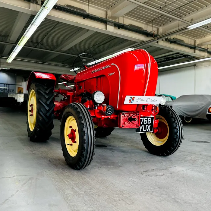 O caracteristică neobișnuită a tractorului Porsche a fost cuplajul hidraulic dintre motor și cutia de viteze, care permitea schimbarea treptelor de viteză fără acționarea ambreiajului. Astfel, devenea foarte ușor de utilizat și întreținut de către fermieri, reducând în același timp uzura componentelor transmisiei. A păstrat, desigur, aspectul tipic Porsche: vopsea roșie și capota motorului elegantă și înclinată. Construit în anul 1958, modelul este o piesă minunată din istoria Porsche și este unul dintre cele mai rare modele pe care le puteți admira la galeria Țiriac Collection”, mai scrie pe pagina de Facebook „Tiriac Collection”.