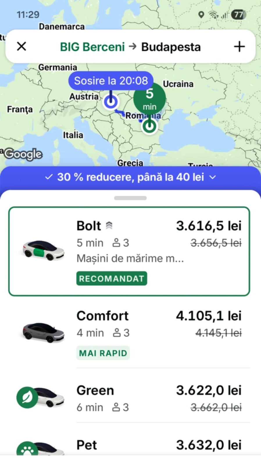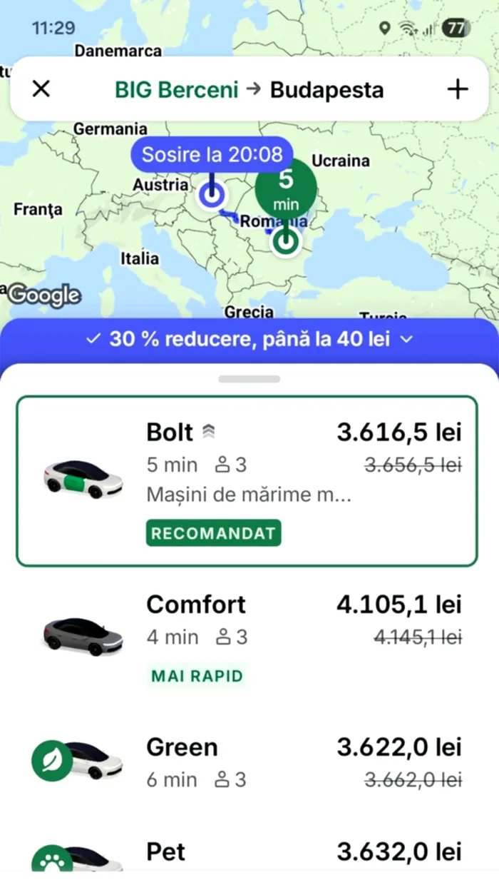 Cât a plătit un client BOLT pentru o cursă din Berceni în Budapesta