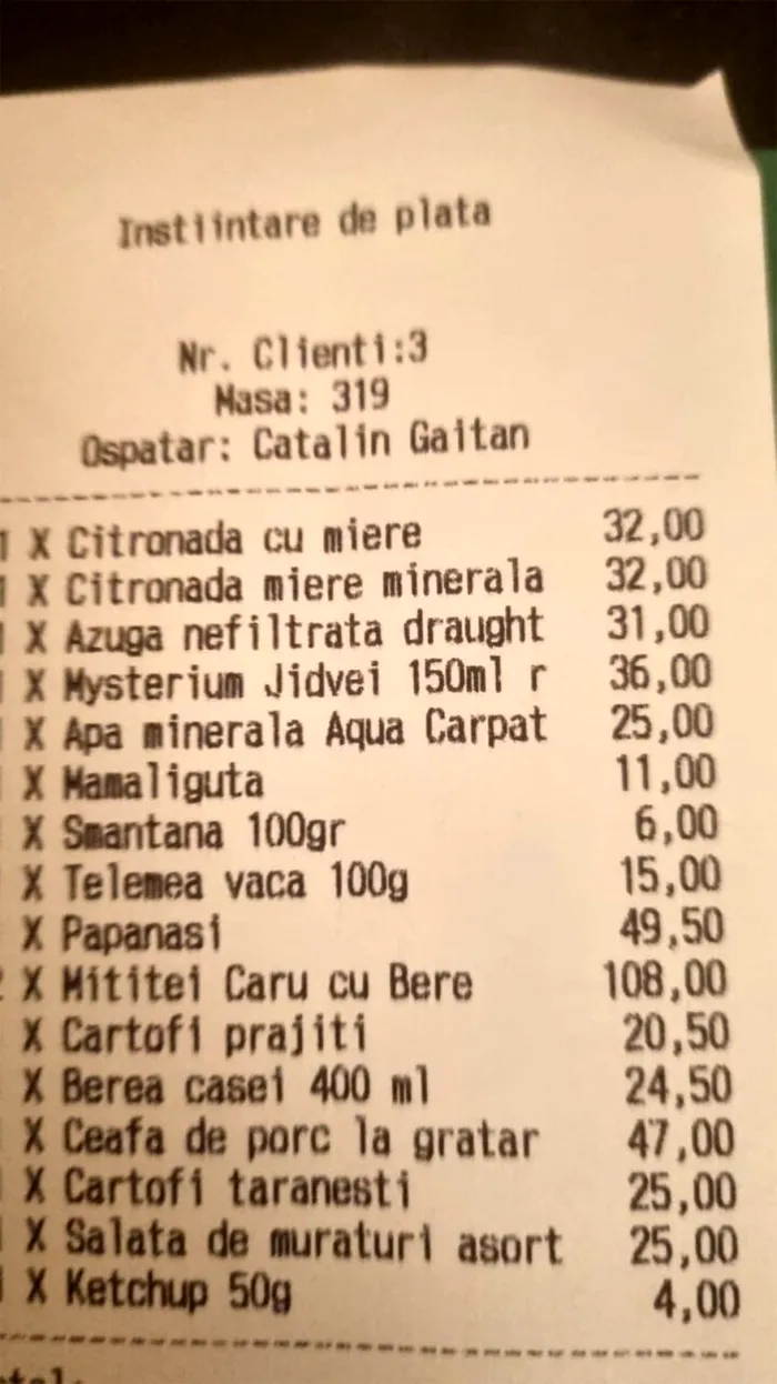 La o privire mai atentă pe nota de plată se poate observa că o limonadă cu lămâie costă 32 de lei, iar o porție de cartofii prăjiți costă mult mai puțin, adică aproximativ 20 lei.