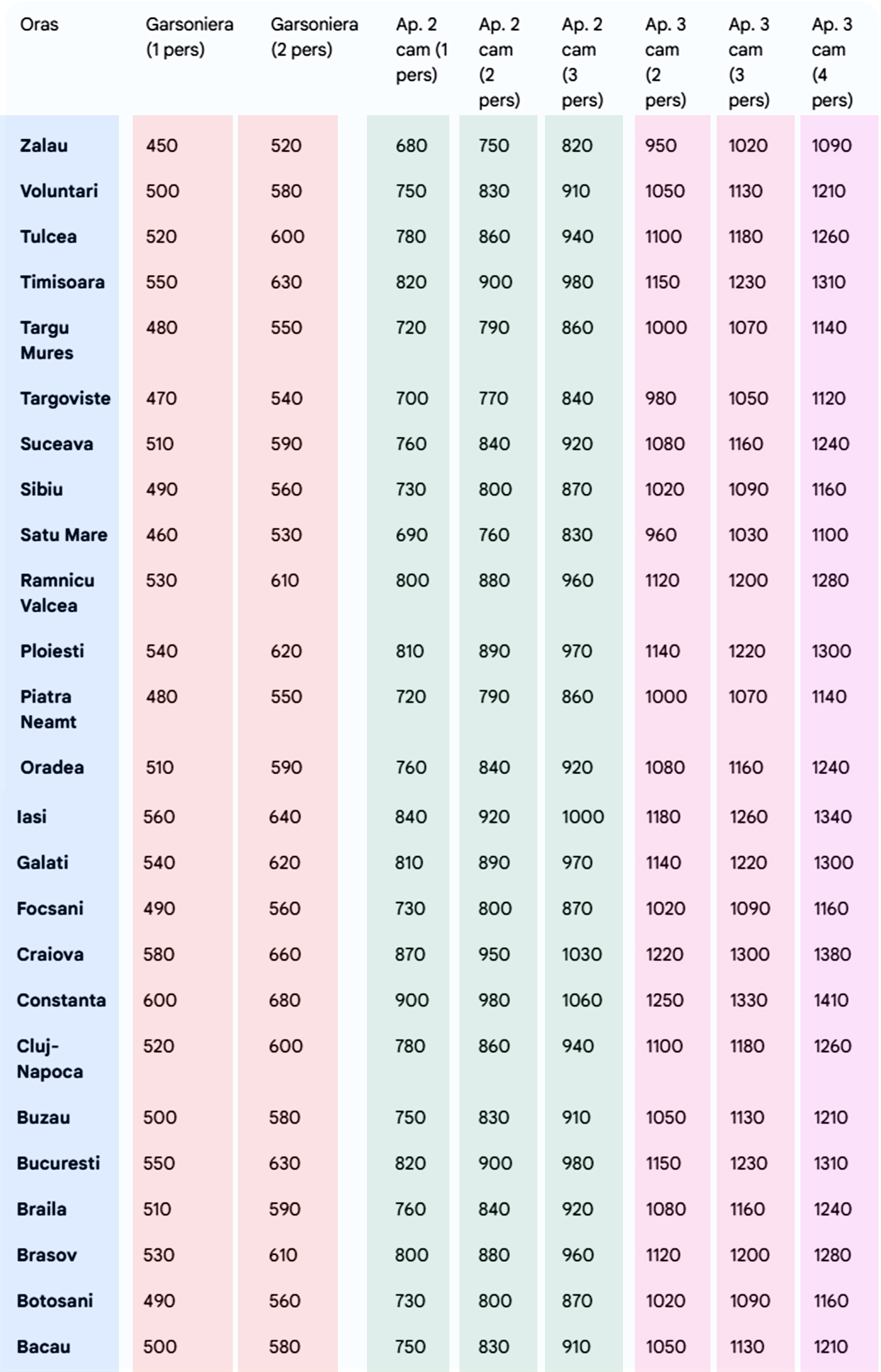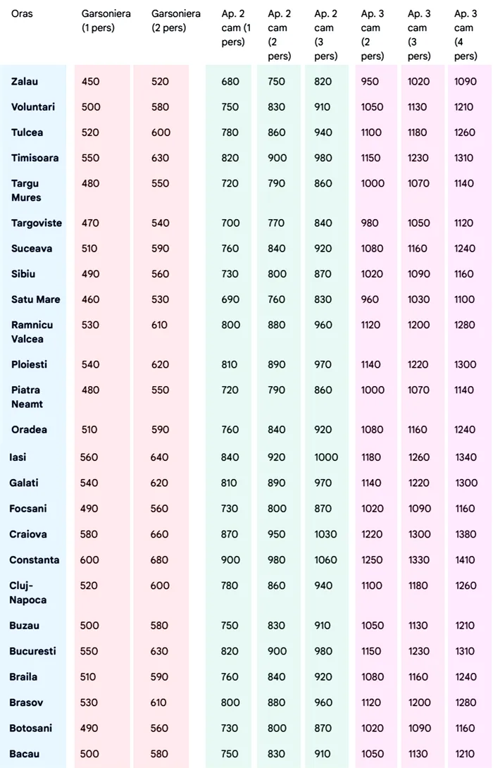Cel mai mic cost pentru o garsonieră în care trăiesc 2 persoane este găsit în orașul Zalău, cu 520 de lei pe lună. Cel mai mare cost pentru același scenariu este aferent orașului Constanța, cu 680 de lei.