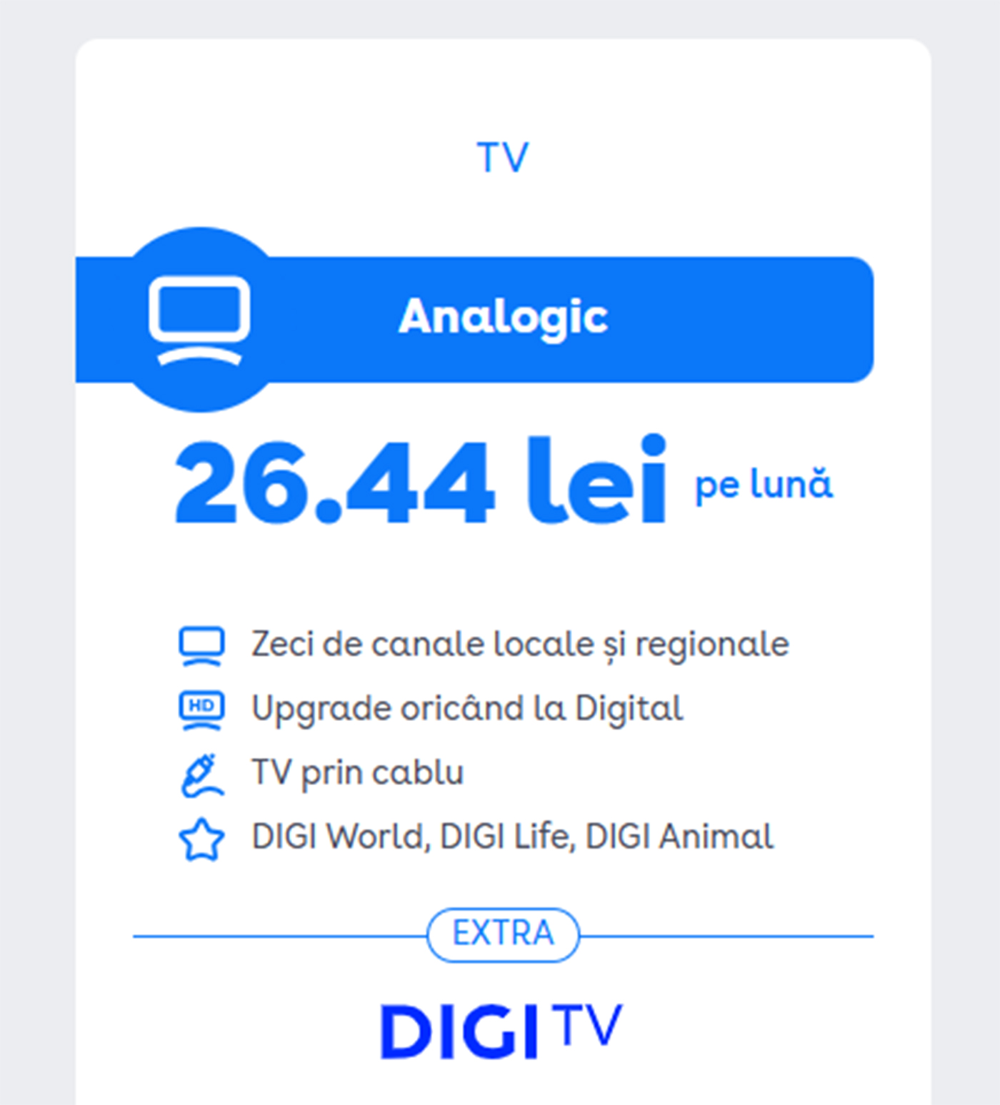 Cei care sunt abonați la Digi știu deja că pot opta pentru diverse abonamente TV, de la cel mai ieftin la cel mai scump. În ce privește cel mai ieftin abonament de TV, ei bine, acesta costă 26,44 de lei pe lună. Potrivit specificațiilor, abonamentul conține 48 de canale TV, printre care Digi World, Digi Life și DIgi Animal, după cum se arată în imaginea de mai jos.