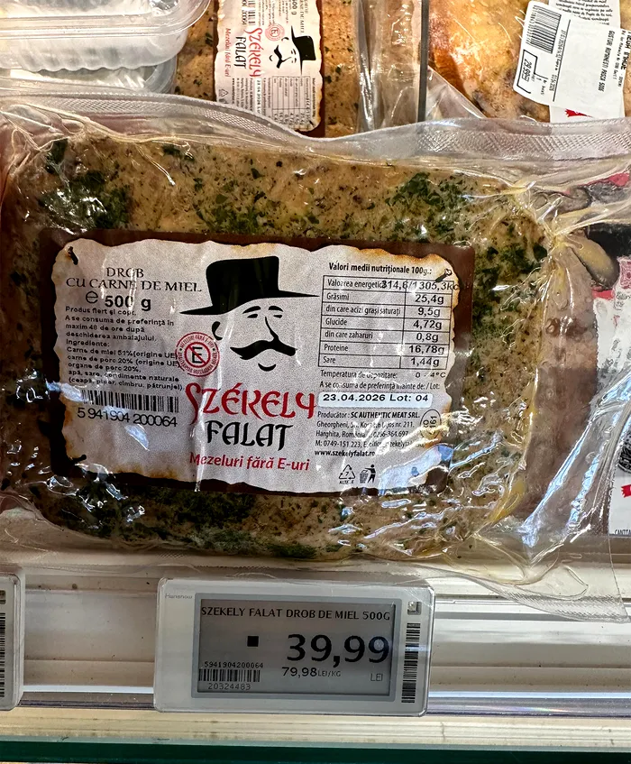 De exemplu, într-un magazin Mega Image, un drob de miel ambalat, de 500 de grame, se vinde cu 39,99 lei. Asta înseamnă un preț de 79,98 lei/kg, potrivit informațiilor afișate la raft. Produsul este comercializat sub brandul „Székely Falat”.
