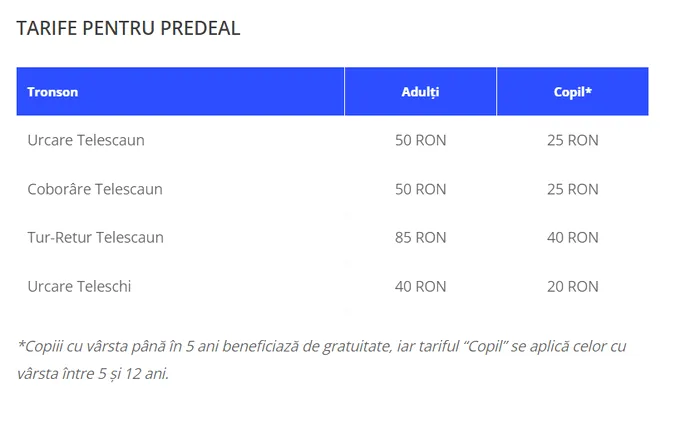 De exemplu, o urcare cu telescaunul costă 50 de lei pentru un adult și 25 de lei pentru un copil. Aceleași tarife sunt și pentru coborâre.