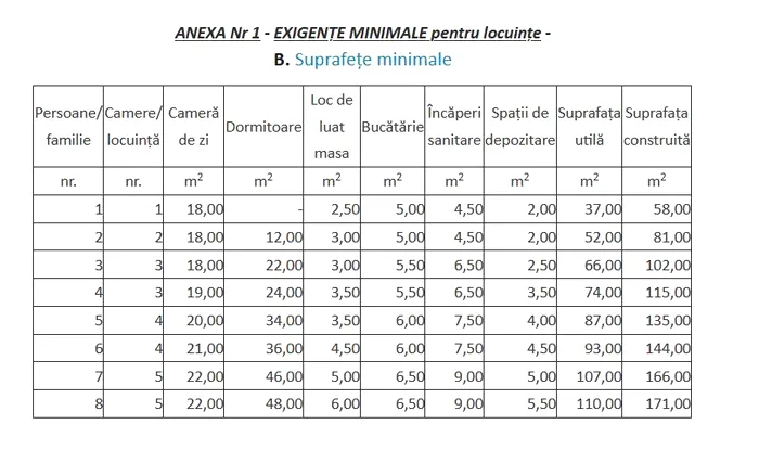 – Suprafaţa construită pe locuinţă, prevăzută în tabelul B, este suma suprafeţelor utile ale încăperilor, logiilor, balcoanelor, precum şi a cotei-părţi din suprafeţele părţilor comune ale clădirilor (spălătorii, uscătorii, casa scării, inclusiv anexele pentru colectarea, depozitarea şi evacuarea deşeurilor menajere, casa liftului etc.), la care se adaugă suprafaţa aferentă pereţilor interiori şi exteriori ai locuinţei; în cazul încălzirii cu combustibil solid, se adaugă suprafaţa aferentă sobelor şi cazanelor de baie. Nu sunt cuprinse suprafaţele aferente boxelor de la subsol şi ale garajelor care pot fi prevăzute distinct.