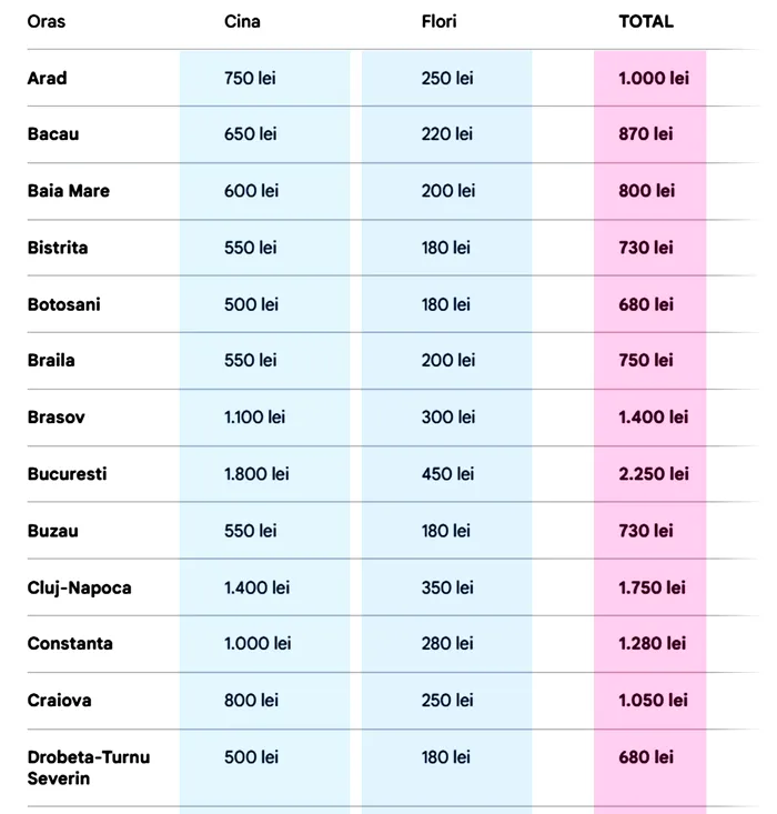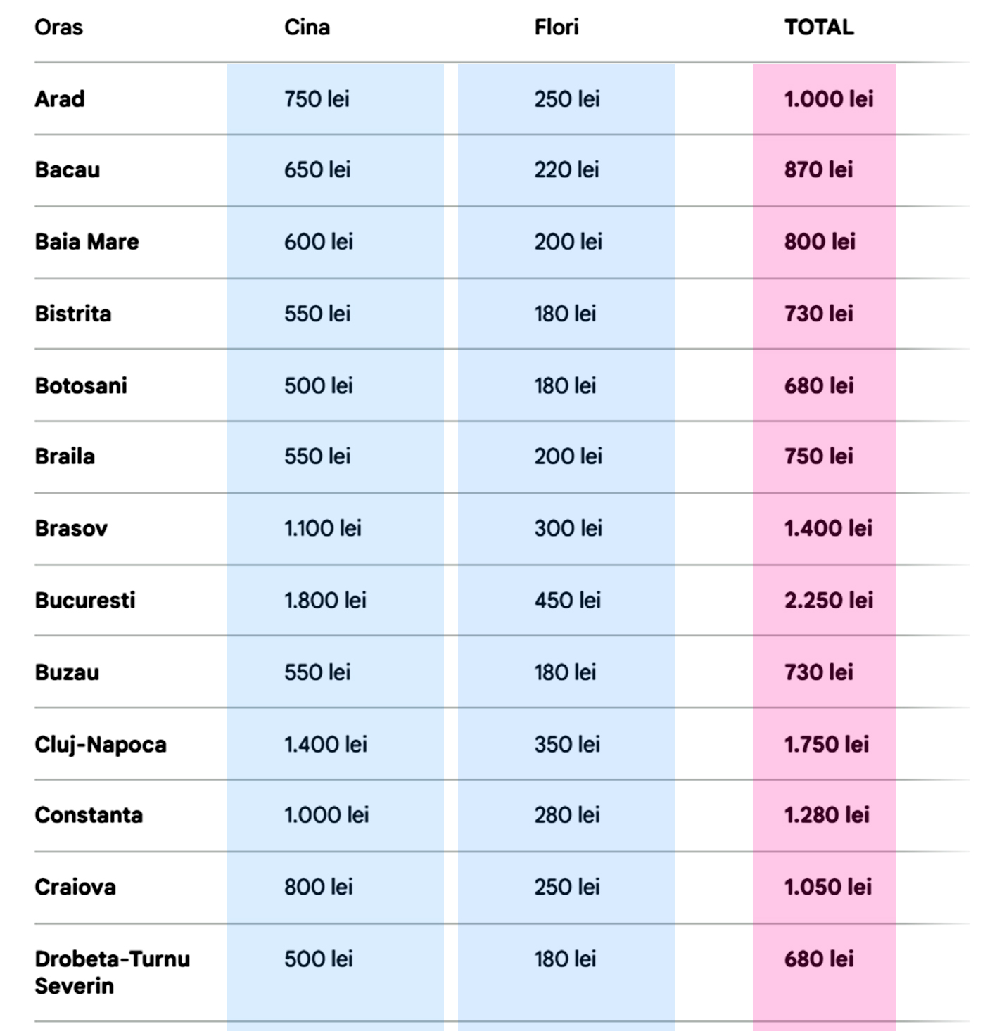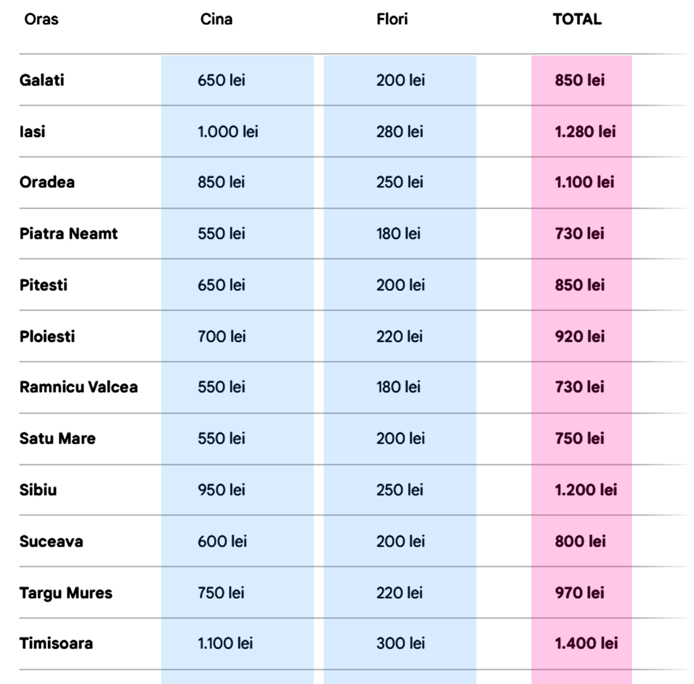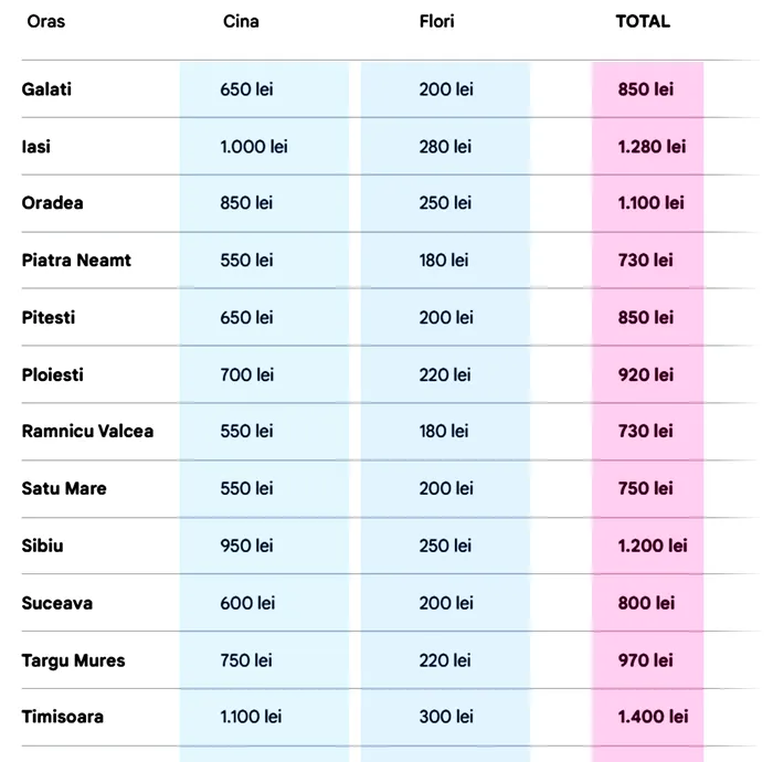 Diferențele sunt evidente și în alte orașe importante. În Cluj-Napoca, costul total pentru o întâlnire ajunge la aproximativ 1.750 de lei, în timp ce în Brașov și Timișoara suma se situează în jur de 1.400 de lei.