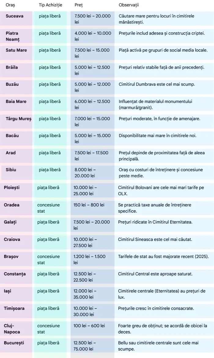 La Ploiești, Craiova, Suceava, Satu Mare, Târgu Mureș, Arad, Constanța, Iași, Timișoara și București se află printre cele mai scumpe locuri de veci.
