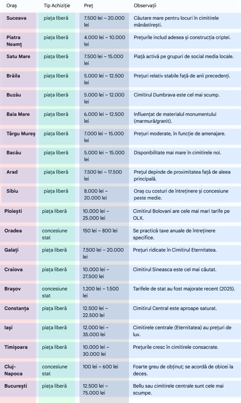 - Sibiu – locul de veci achiziționat pe piața liberă. Prețul se situează între 8.000 și 20.000 de lei. Observație: oraș cu costuri de întreținere și concesiune peste medie.