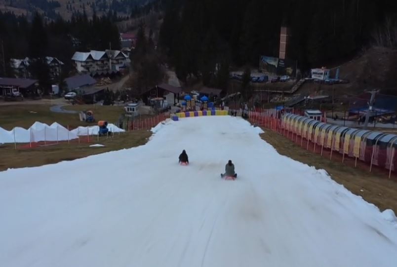 Chiar și în condițiile în care nu a nins, încă, în stațiune, iar temperaturile se mențin pozitive, administratorii de pârtii au deschis câteva zone cu zăpadă artificială. La Durău, de exemplu, copiii au fost cei mai bucuroși când au alunecat cu saniile pe pârtie. Între timp, adulții au putut să se înfrupte din diverse preparate tradiționale.