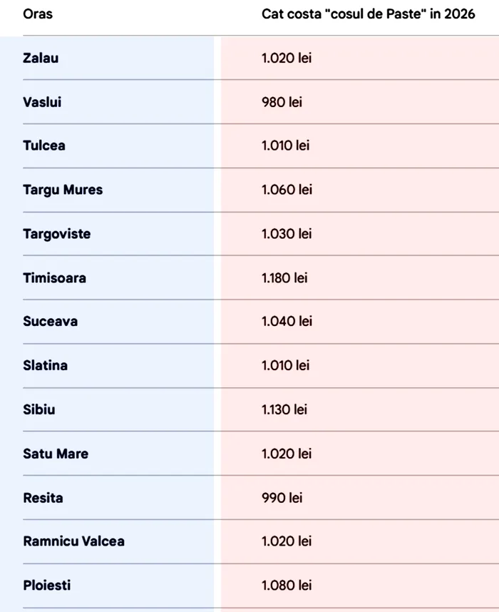Ca în fiecare an, sărbătorile pascale înseamnă, pe lângă bucuria spirituală a momentului Învierii Domnului, și alergături prin oraș pentru cumpărăturile necesare pregătirii unei mese îmbelșugate. GÂNDUL.RO vine în ajutorul dumneavoastră cu o informație prețioasă: am calculat cât te costă „coșul de Paște” (adică, toate cumpărăturile) în 2026, în funcție de localitatea din România în care trăiești.