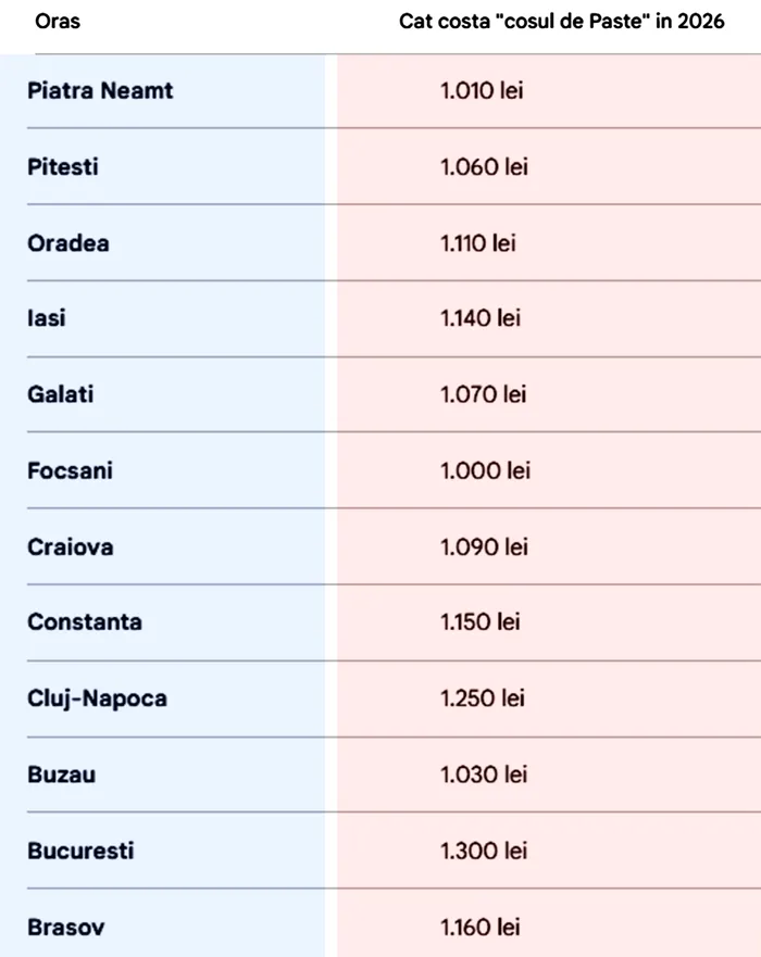 Potrivit datelor analizate, Bucureștiul se află pe primul loc în topul celor mai scumpe orașe. Aici, costul mediu al coșului de Paște este de aproximativ 1.300 de lei. Pe locul 2 se situează Cluj-Napoca, unde o familie trebuie să aloce în jur de 1.250 de lei pentru aceleași cumpărături.