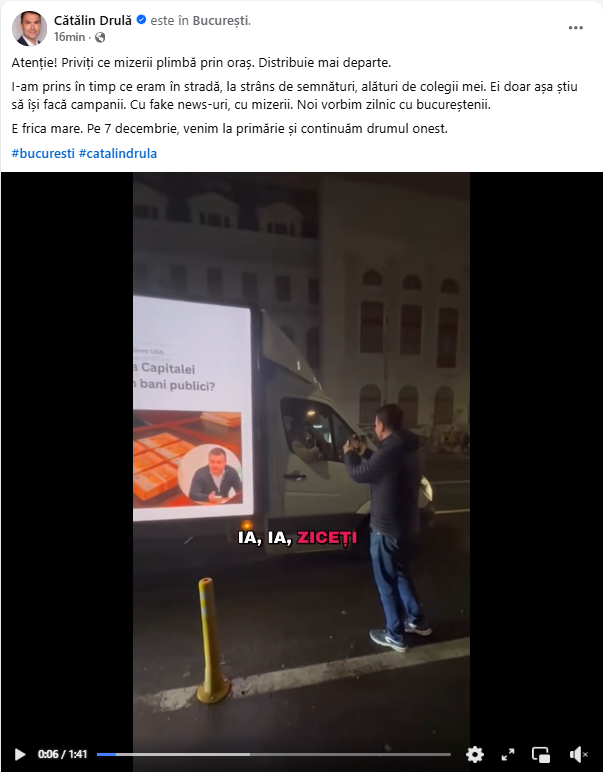 Cătălin Drulă, candidatul USR la Primăria Capitalei, a oprit, o mașina unei publicații, luni seară, în zona Universitate, pe care afișate informații despre averea de peste 2,5 milioane de dolari a politicianului, conform declarației de avere a acestuia. Drulă i-a luat la întrebări pe șoferi, cărora le-a adresat cuvinte dure, precum intoxicați, securiști și i-a amenințat că îi va da în judecată.