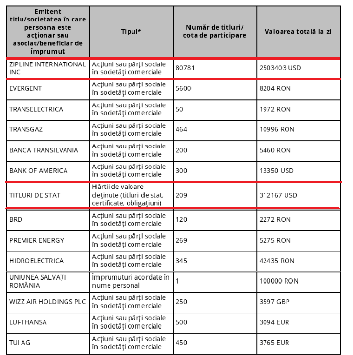 Politicianul a declarat conturi și investiții la mai multe bănci și platforme internaționale, inclusiv BCR, Banca Transilvania, Credit Europe Bank, Revolut, Saxo Bank, Equity Zen și Interactive Brokers, în lei, euro, dolari și lire sterline.